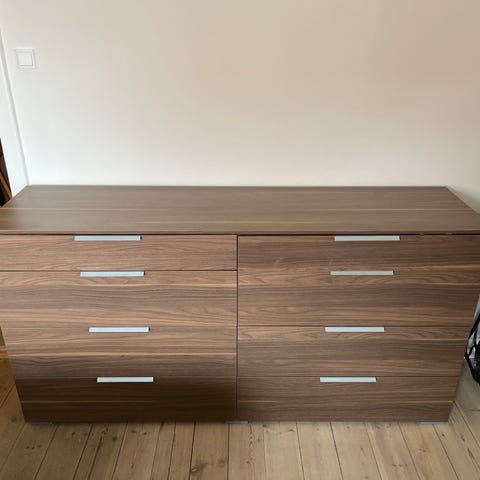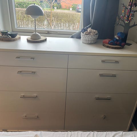 Hvid kommode med 3 dybe skuffer og 1 lille skuffe i den øverste skuffe. Kan hentes indtil d. 31/3.
