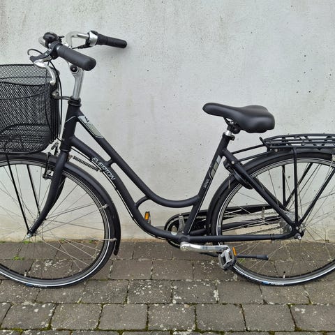Flot Everton damecykel, sort med 7 indvendige gear., håndbremse og fodbremse. Cyklen har ikke kørt ret meget og fremstår i fin stand. Den er monteret med godkendt lås, cykelkurv støtteben og bagagebærer.