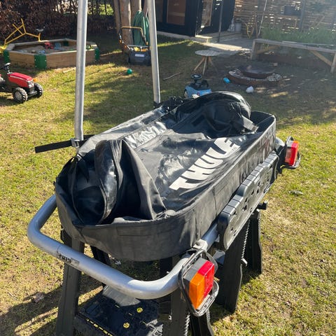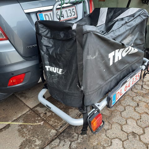 Thule bagageholder til at sætte på anhængertrækket. Der medfølger stor rummelig vandtæt bagagepose til at spænde fast. Lige til at pakke alt det, som der ikke er plads til i bilen til påske- eller sommerferien. Nummerplade medfølger ikke. Nummerplade koster 110 kr. At bestille fra Motorstyrelsen.