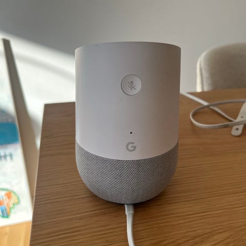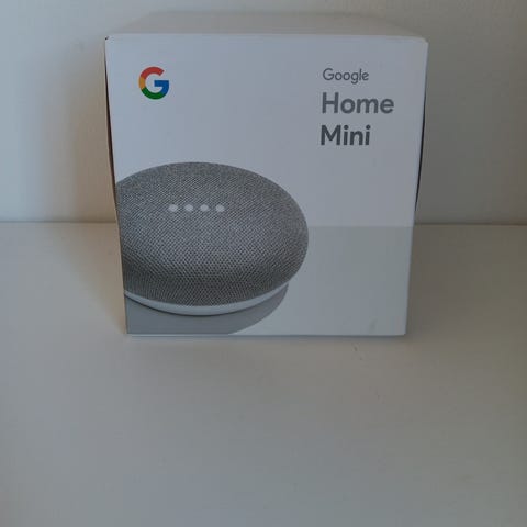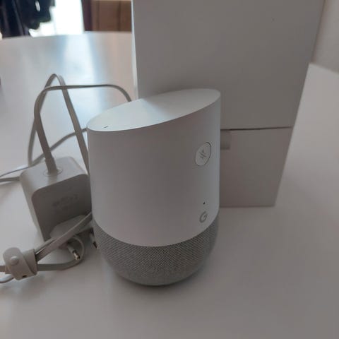 Google Home Mini smart højttaler i grå tekstil. Fungerer uden problemer.