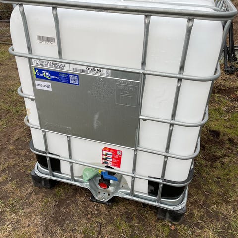 Vandtank / beholder på 1000 liter. Beholderen er monteret i metalbur med palle i bund.