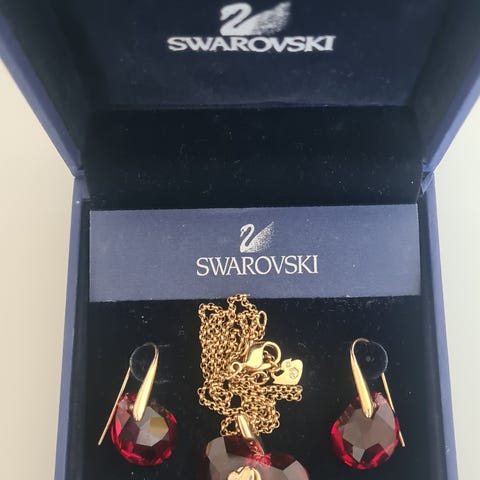 Swarovski smykkesæt med halskæde og ørestikker til kvinde. Sættet er udført i forgyldt metal og prydet med klare Swarovski krystaller. Vedhænget på halskæden består af en rund cirkel med små krystaller og en større krystal i midten. Ørestikkerne har matchende cirkelmotiv med krystaller. Sættet leveres i original Swarovski-æske som vist på billederne. I rosaguld, brugt 2 gange