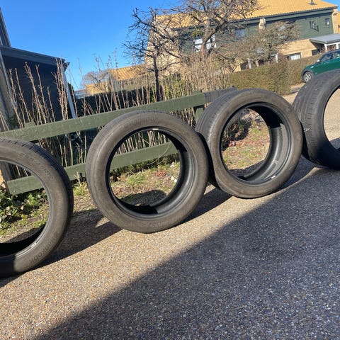 Originale Hankook dæk fra Tesla Model Y med støjreducerende skumindlæg. Har kørt ca. 17.000 km.