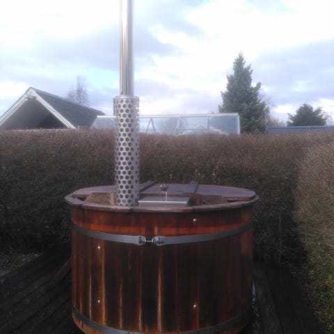 Vildmarksbad med lodretstående træstaver og metalbånd omkring ydersiden. Badet opvarmes via en indbygget brændefyret ovn med skorsten.