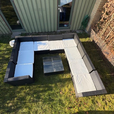 Modul loungesæt til haven i sort polyrattan med grå hynder. Sættet består af flere modulopbyggede sofasektioner, som kan sammensættes til hjørnesofa eller enkeltstående moduler, samt et lille bord eller skammel i samme materiale. Ryglæn og sider er flettet i polyrattan, og sæde- og ryghynder har aftagelige betræk i gråt stof. Velegnet til terrasse eller altan som udendørs siddegruppe. Bemærk at der er lidt forskel i det sorte flet, hvis man kigger godt efter, se billede 2 og 3. Der medfølger 3 ekstra hynder som ikke ses på billedet. Den ene side er løs men kan sættes på, er ikke beskadiget, se sidste billede.
