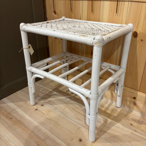 Dekorativt sidebord / sengebord i bambus med flettet top og praktisk hylde nedenunder.