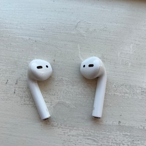 Trådløse hovedtelefoner i original æske. Opladningsetuiet har et godt batteri og kan holde i ugevis. Under brug kan batteriet i hovedtelefonerne holde i ca. 1,5 timer ved stuetemperatur.