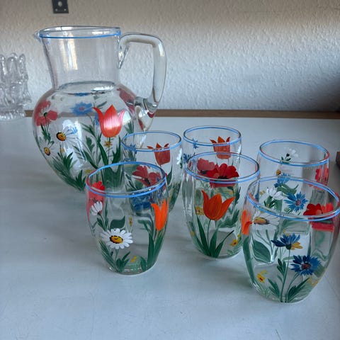Vintage Kande og 4 drikkeglas i glas i sæt. Sættet består af en gennemsigtig kande med farvet bund og fire matchende drikkeglas i forskellige farver (gul, lilla, rød og grøn). Glassene har let konisk form, og kanden har hank og hældetud. Velegnet til servering af kolde drikke ved bordet eller til hverdag i køkkenet.
