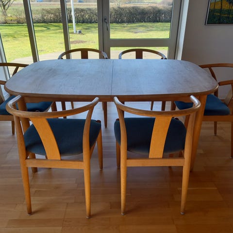 Elegant og funktionelt spisebord i lys eg med tilhørende 6 stole.