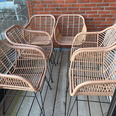 6 udendørs fletstole i brun/grå polyrattan. Vi har haft stolene i et par år. De har stået udenfor, men de ser stort set nye ud. Jeg har ikke kunne finde noget slid. Der følger ikke nogen puder med, og de sælges kun samlet. Jeg kender ikke mærket på stolene. De er købt i en lille møbelbutik i Vedbæk, og den findes desværre ikke mere. Vi gav selv 1200,- pr stol. Vi sælger dem nu for 700,- pr stol, så 4200,- i alt. De kan hentes i Vedbæk.