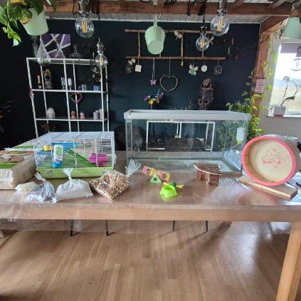 Terrarie/akvarie til smådyr i glas. Sættet omfatter løbehjul i plast og træ, træhus, vandflaske på træholder, foder- eller vandskål samt ekstra gittersektion. Egnet til mindre kæledyr som f.eks. hamster eller andre små gnavere, hvor der er behov for et lukket et bur med tilbehør til aktivitet, vand og foder.