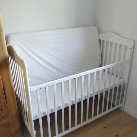 Grå Tremmeseng som kan foldes sammen. Sælges inkl lagen og madras. Sengen kan foldes sammen og passe under en seng. Sengen er brugt som ferieseng og fremstår som ny.