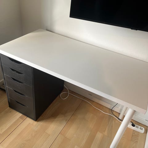 Skrivebordet er praktisk indrettet med 2 hvide ben på den ene side og skuffemodul på den anden, så det både fungerer som bord og opbevaring i ét.