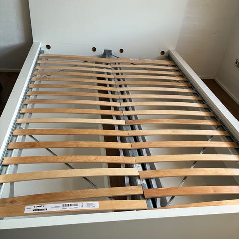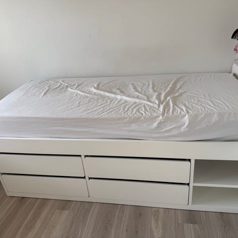 IKEA seng med opbevaringsskuffer i hvid. Sengen har lamelbund og to store skuffer. Sengen kan bruges som enkeltseng eller dobbeltseng og giver ekstra opbevaringsplads i skufferne under sengen.