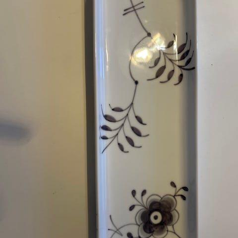 Royal Copenhagen rektangulært fad i hvidt porcelæn. Fadet har let afrundede hjørner og diskret rillet dekoration langs kanten. Længden er ca. 36 cm, som vist på målebåndet på billederne. Velegnet som serveringsfad til fx brød, kager eller anretninger. Bunden er stemplet med Royal Copenhagen-mærke.
