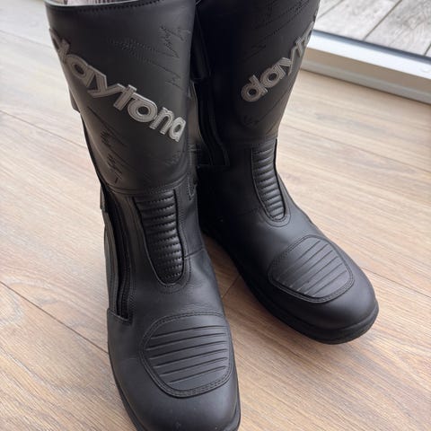 Dainese Nighthawk motorcykelstøvler i sort. Støvlerne er i læder med Gore-Tex membran. De har lynlås i siden, forstærkninger ved ankel og hæl samt skridsikker gummisål. Størrelse EU 44 (UK 10, US 11, AAM 285). Velegnet som motorcykelstøvler til brug i skiftende vejrforhold. Er små i størrelsen