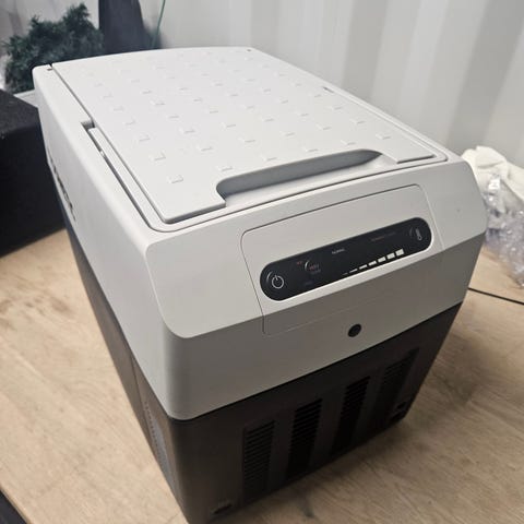 Mobicool elektrisk køleboks i grå plast. Boksen har låg med integreret køleaggregat og ventilator samt bærehåndtag i siderne.