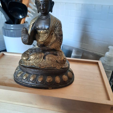 Sælger denne smukke og dekorative Buddha-statue i massiv messing. Statuen er udført med stor sans for detaljer – læg især mærke til de fine graveringer i dragten og det karakteristiske udtryk af dyb ro og balance.