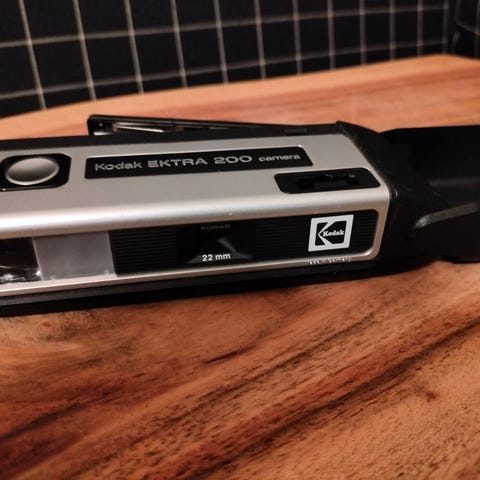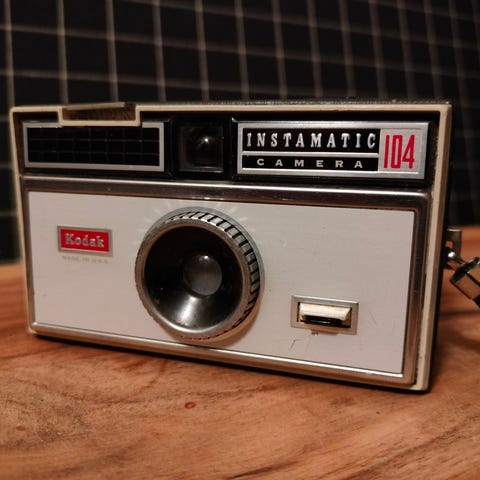 Kodak EK2 instant kamera i hvid og blå. Kameraet er et analogt instant-kamera, der bruger selvfremkaldende film (instant film). Fronten har en blå objektivsektion med udløserknap og søger, og huset er overvejende hvidt med sorte detaljer. Kameraet er velegnet til øjebliksbilleder og kan bruges som brugskamera eller som dekorativt retrokamera i en samling af analoge kameraer.