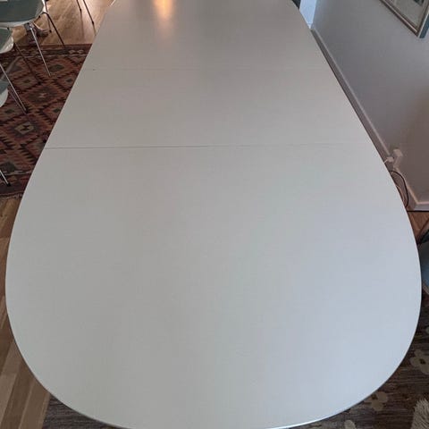 Meget fint og næsten nyt bord model B619. Inkl. to udtræksplader (L: 180-300 cm). Bordpladen er den nye hvide matte overflade som er meget brugsvenlig. Næsten nyt bord fra 2023 men kun brugt i 18 mdr. Bordkanten er børstet aluminium. Stel er i krom.