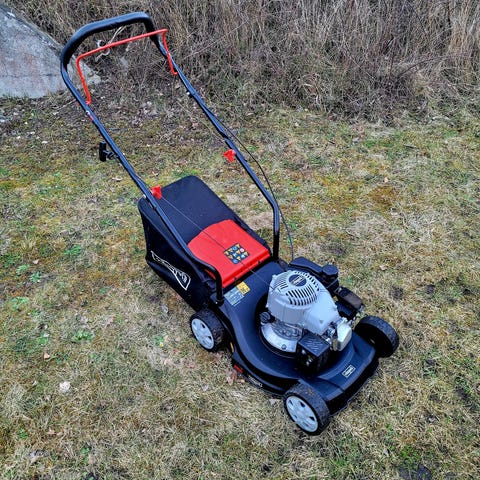 Scheppach benzindrevet plæneklipper i sort og rød. Plæneklipperen har forbrændingsmotor med 131 cc ifølge mærkningen på motorhuset. Modellen er udstyret med opsamlerbag og fire hjul. Håndtaget er buet med betjeningsbøjle. Velegnet til klipning af græsplæner, hvor der ønskes opsamling af afklippet græs.
