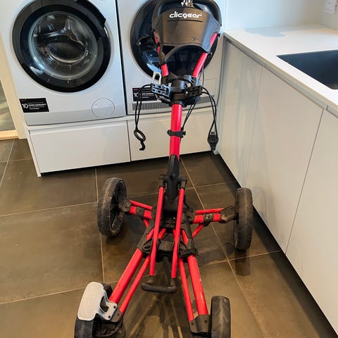 Sammenklappelig push-golfvogn med tre hjul og håndtag for nem manøvrering på banen. Vognen har sort stel med detaljer i rød og er egnet til at transportere en golfbag. Modellen er designet til stabilitet og kan foldes sammen for lettere opbevaring og transport i bil eller skab.
