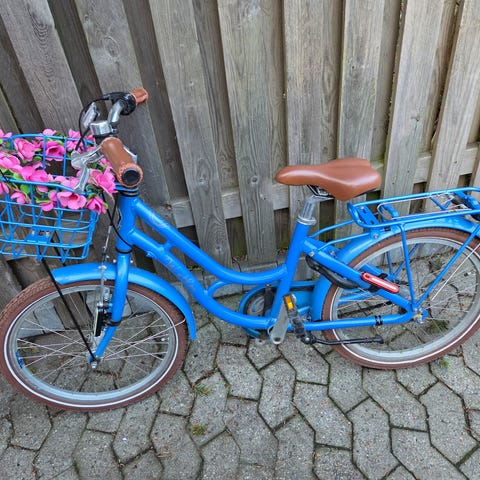 Børnecykel med 20" hjul i lilla og blå farve. Stel Str 38 og 3 gear. Cyklen har lige styr, saddel med justerbar højde, kædeskærm og bagagebærer. Velegnet til børn cirka 5-8 år , der passer til en cykel med 20" hjulstørrelse