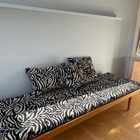 Sælger denne fine zebra betræk som måler 70x190 cm. Plus 3 pudebetræk. Alle med lynlås så det nemt kan tages af og vaskes.
