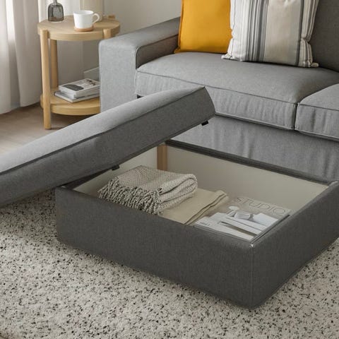 Fin IKEA KIVIK puf i pænt gråt meleret stof, der er opbevaring i puffen. Kan hentes i Bjerringbro.