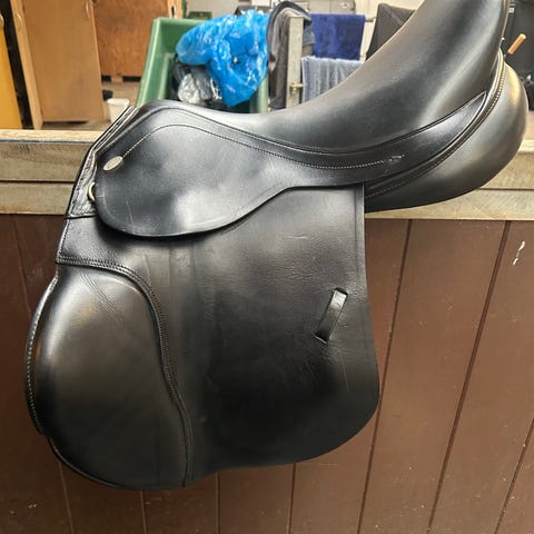 Rigtig god springsadel, der har 2 små skader. Se de sidste 2 billeder (1 lille skade ved den ene knæpude, er lille hak bagpå), ingen af delene har betydning for brugen.