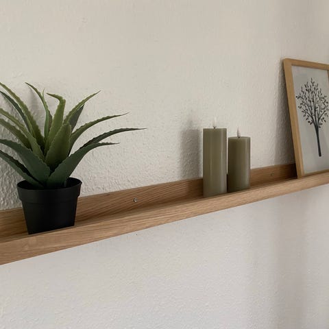 Mix alle dine yndlingsbilleder på denne gallerihylde og skab personlighed i din indretning. Det er nemt og hurtigt at forny din udstilling ved at rykke rundt eller skifte ud i billederne. Tilføj også gerne en lille lysestage eller grøn plante. Gallerihylden få i ca.18 mm masivt ubehandlet eg