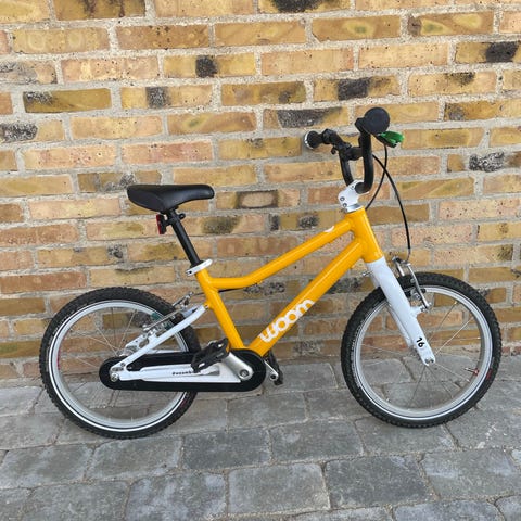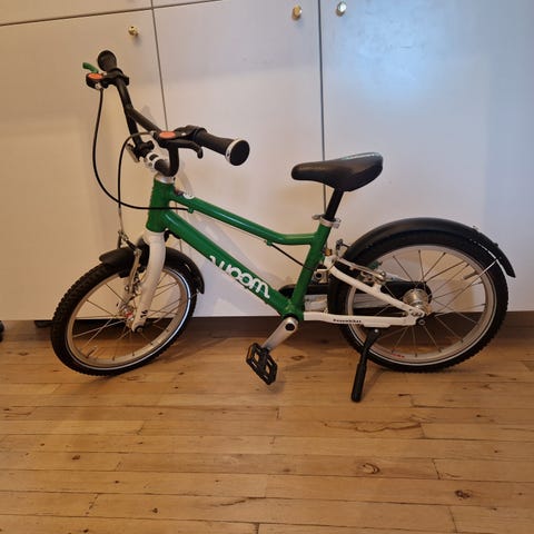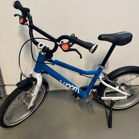 Woom 3 børnecykel med 16" hjul. Cyklen har let aluminiumsstel i blå og hvid med lav indstigning. Udstyret med sort saddel og sorte pedaler. Dækkene har mønster, der egner sig til både asfalt og lettere grus. Styret har håndbremser til for- og baghjul. Velegnet som børnecykel i den størrelse, der passer til 16" hjul. Ca 3-6 år.