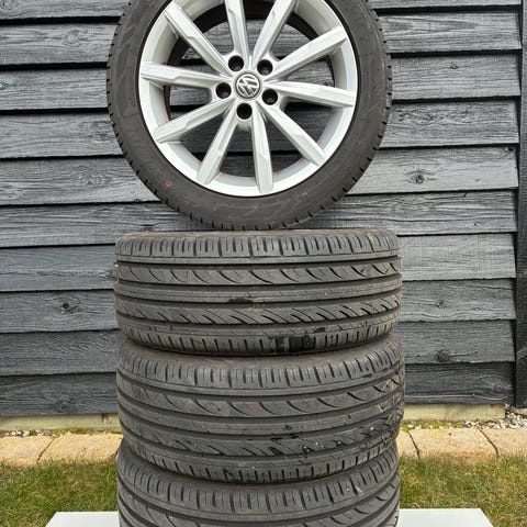 4 JR 38 alufælge med dæk i størrelsen 8X18”. Hulmål 5X100. ET42. Navhul 57,1 med centreringsringe (67,1 uden centreringsringe).