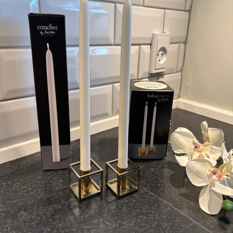 Sælger 2 stk guldbelagte By Lassen / Audo Copenhagen (det gamle Menu) kubus mikro lysestager til juletræslys