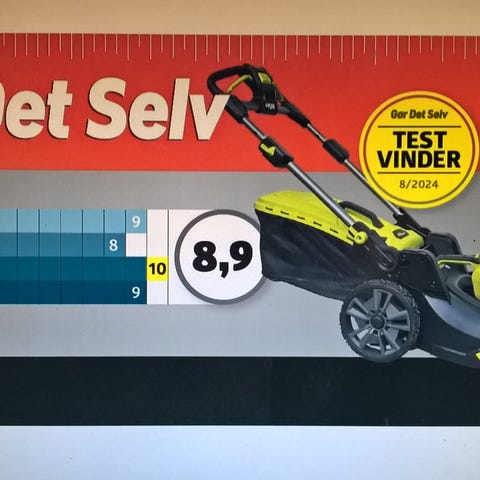 Ryobi Max Power plæneklipper med 46 cm klippebredde og kulløs motor.