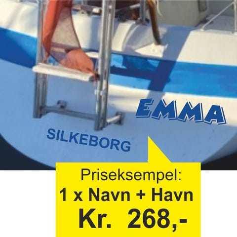 Navnet kan tilpasses i skrifttype, størrelse og farve efter behov. Egnet til både sejl- og motorbåde.