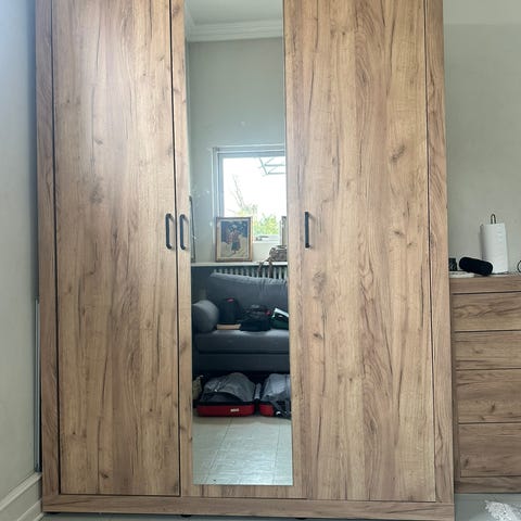 Sælger en stor og robust garderobe i træ i god stand. Perfekt til familier eller alle, der har brug for meget opbevaringsplads.