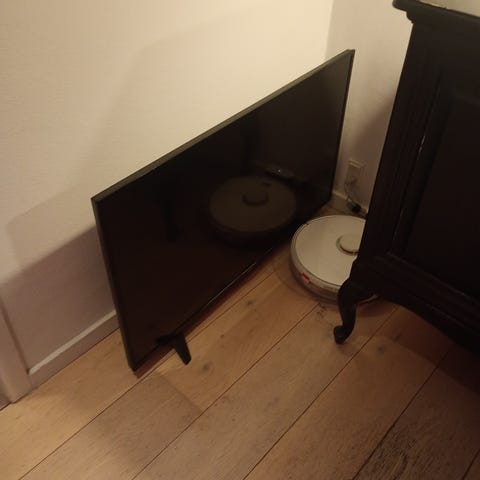 All4one tilpasset trefod, custom birk bagplade, Sony Android TV, JBL soundbar, én fjernbetjening, én netledning. Plads og kabler forberedt til eks Apple TV.