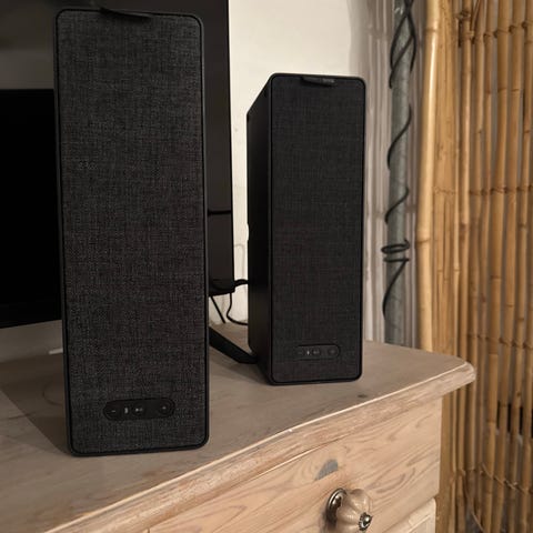 Sonos/symfonisk højttaler i sort fra Ikea. Kompakt model med stofbetrukket kabinet og strømkabel tilsluttet i bunden. Velegnet til brug i stue, soveværelse eller kontor som del af et lydsystem, som enkeltstående højttaler og som lampe. Uden lampeskærm. Der kan forsat købes nogen forskellige hos Ikea der passer på. Afh i Taastrup. Nulstillet og klar til brug.
