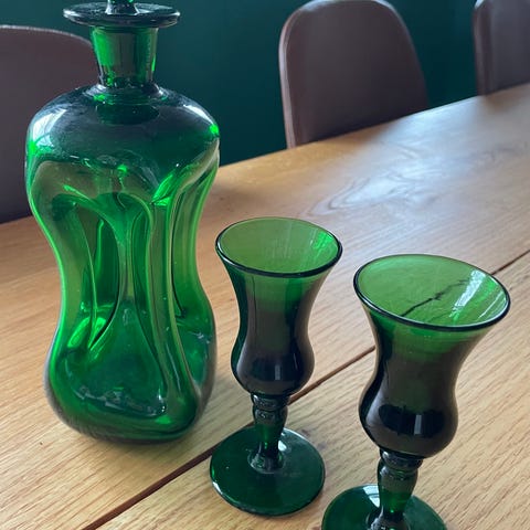 Blå glas karaffelsæt bestående af to flasker med tilhørende glaspropper. Sættet omfatter én høj, buet karaffel og én lavere, firkantet karaffel, begge i gennemfarvet blåt glas med klare glaspropper. Velegnet til opbevaring og servering af fx spiritus, likør eller andre drikke, eller som dekorative elementer i indretningen.