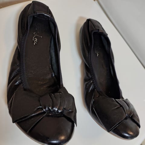 Ballerinaer med hæl, str. 39, brugte men fine til prisen, brugsspor kan forekomme.