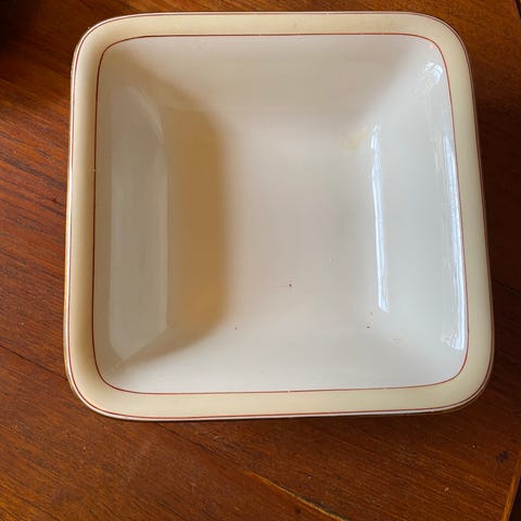 Kvadratisk kartoffelskål i Det spanske stel, fremstillet i perioden 1931 - 1970.
