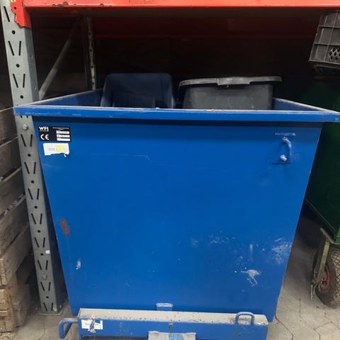Tipcontainer affaldscontainer monteret på hjul og med beslag til gaffeltruck, så containeren kan flyttes og tippes mekanisk.