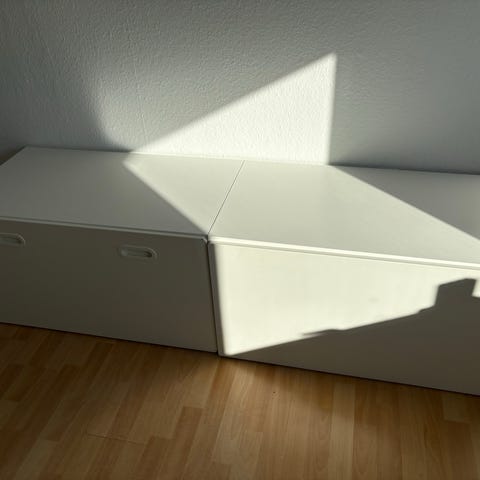 Stuva bænk med skuffe. Vi har brugt den som læsebænk med er skind over og så opbevaring til bamser. Virkelig stor og rummelig. Men har skruehuller og skrammer.