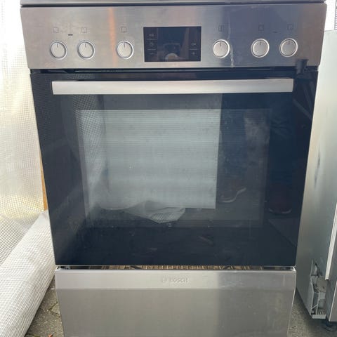 Flot, hvidt, fritstående Bosch komfur med induktionskogeplade med boost funktion. Testvinder i TÆNK. Superfin stand, måler BxDxH - 60x60x90 cm. Inkl. 3 bradepander og rist.