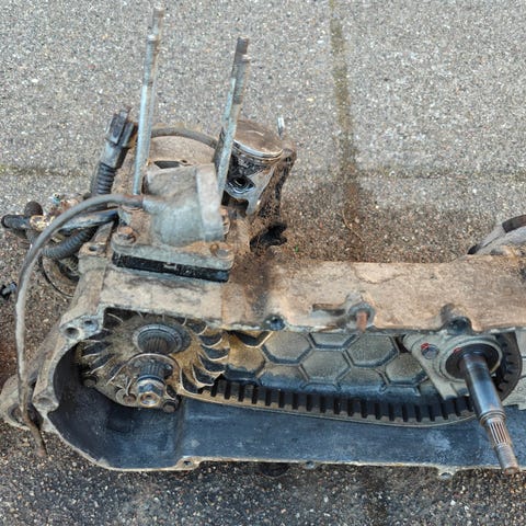 Der sidder benzintank, motorophæng, komplet forgaffel, batteri holder, sidestøttefod og luftslange til kickstarterskjold på stellet.