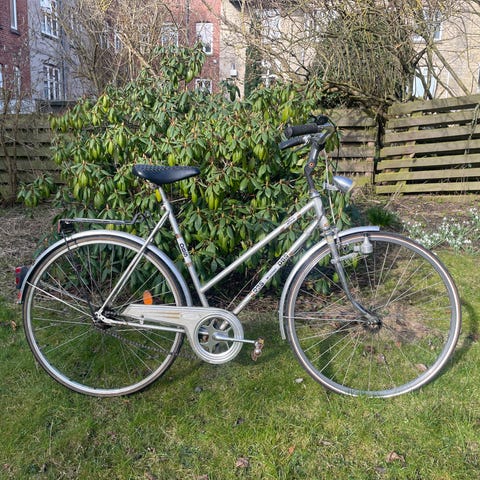 Velkørende bedstemorcykel med syv indvendige shimano Nexus gear, cykelkurv, aluminiumskrank, affjedret sadelpind, støttefod og gode dæk,