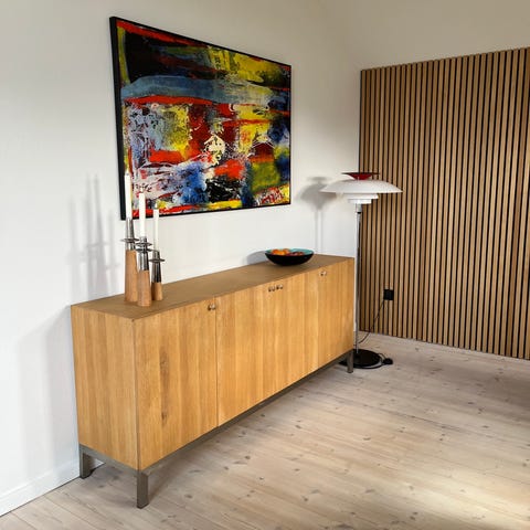 Flot og velholdt Ege skænk med stor skuffe og med skydelåger og indv hylde samt med påsatte ben