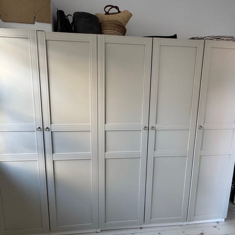 Ikea pax skab sælges. Det ene skab er en halv meter bredt og det andet er en hel meter bredt. Det er den høje og dybe model. Al indmad fremgår af billedet. Kan afhentes på Nørrebro
