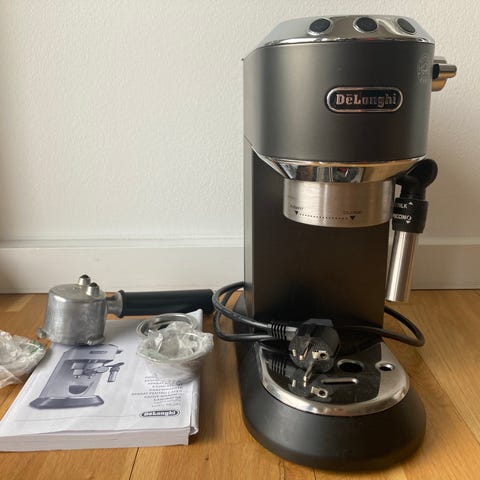 De'Longhi Dedica espresso machine in dark with a metal finish. The machine is a compact semi-automatic espresso machine with a portafilter, removable water tank and steam nozzle for frothing milk. The pictures show accessories such as a portafilter, filter insert and small milk jug. Suitable for brewing espresso and milk-based coffee drinks at home. The machine is operated via buttons on the front and has a drip tray under the spout.